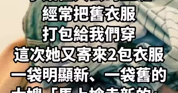 小姑在大公司上班,經常把舊衣服打包給我們穿,這次她又寄來2包衣服,一袋明顯新、一袋舊的,大嫂「馬上搶走新的」,我只分到舊衣,回家一摸口袋嚇傻打給小姑.