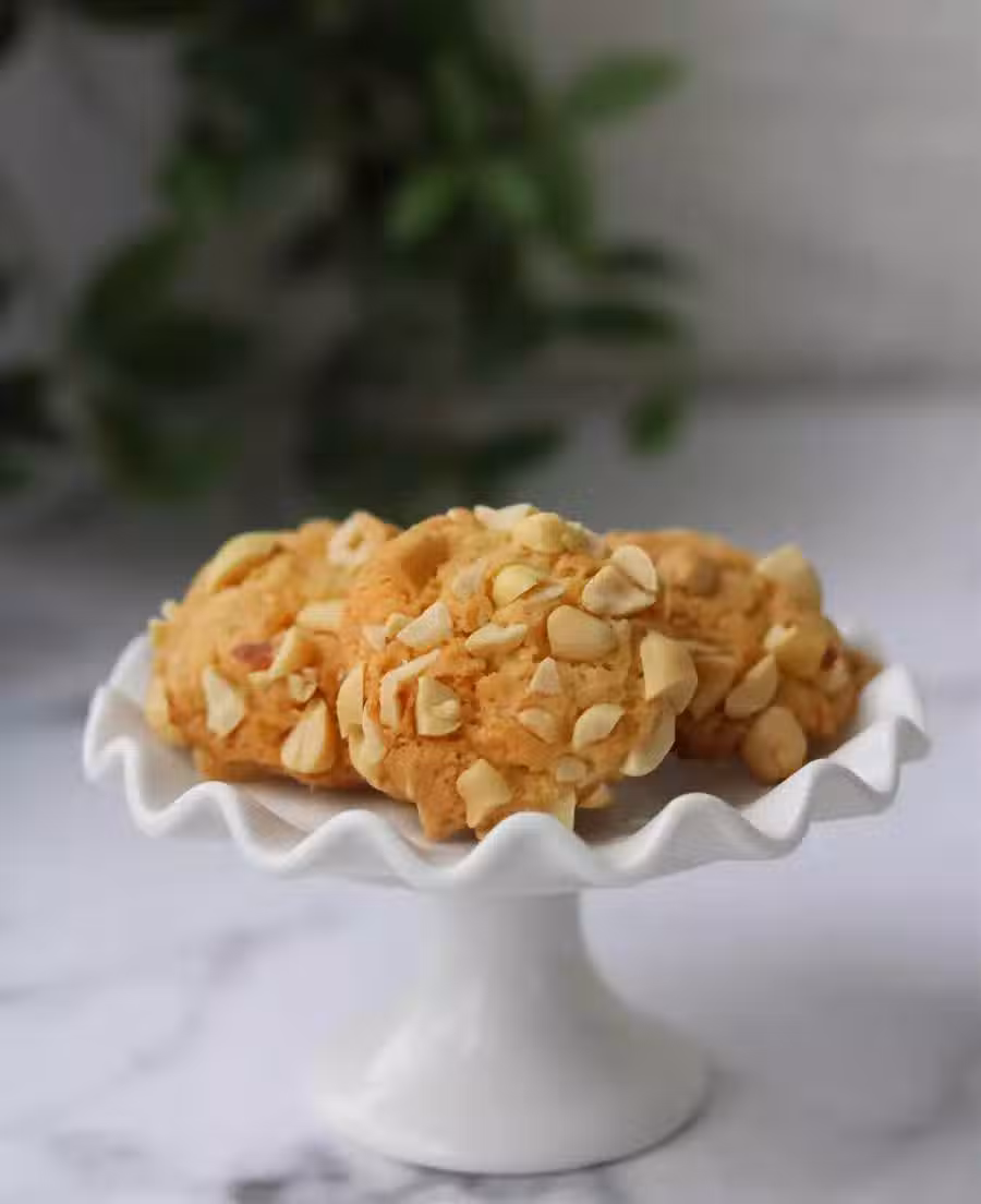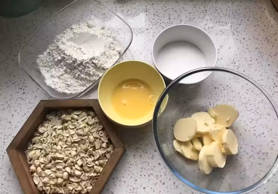 熟花生碎170克,無鹽黃油110克,中筋麵粉150克,雞蛋半個約28克,糖70克,泡打粉2克,小蘇打1克