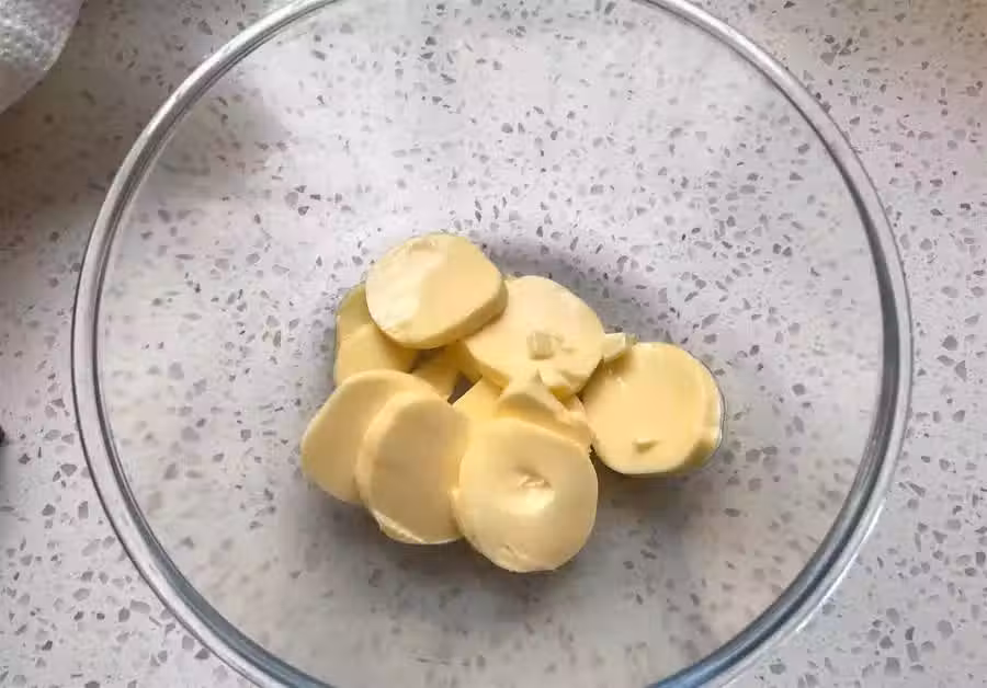 4、先把黃油軟化,軟化就是可以用手指輕鬆在黃油戳出手印。