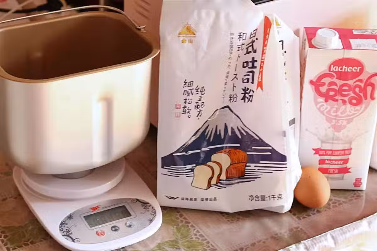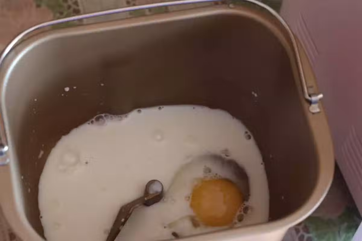 2.先把牛奶、雞蛋放入麵包機桶內。(液體先入)