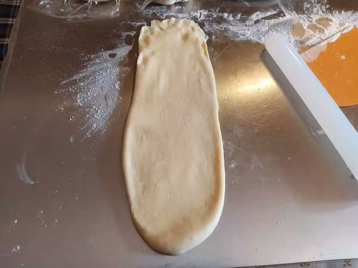 12.再取一個擀卷的麵團,再次擀成長舌狀,不要來回擀,在中間固定,然後用擀麵杖朝兩邊拉長,長度要比之前長一些。