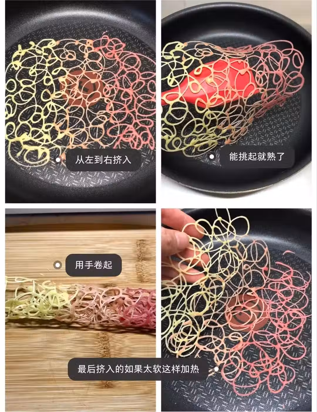 6.】裱花袋剪很小一個口子,從左到右分別畫圈擠入平底鍋,第二個顏色壓在第一個顏色上,儘量不要有大疙瘩