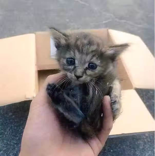 這只小流浪貓,是原來的主人將牠放到路邊不要的,然後一位飼主帶著五隻雪豹出去玩時被雪豹發現的。