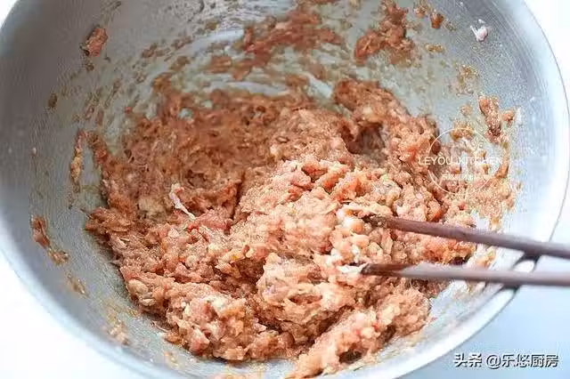 第三步:把肉餡放入盆中,然後放入2勺姜水、2勺蔥水、1勺食用油、1勺生抽、半勺老抽、1勺蚝油、少許鹽、半勺料酒、少許雞精、半勺白糖、少許白鬍椒粉、2勺玉米澱粉,接下來朝著一個方向攪拌均勻,攪拌至肉餡上勁兒。蔥水、姜水也可以分多次放,每放一次等充分攪拌吸收,再放下一次。這樣,肉餡就拌好了。