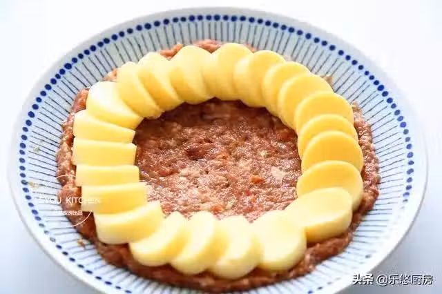 第六步:把玉子豆腐擺在肉餡上,如圖,圍一圈,放在肉餡邊上。
