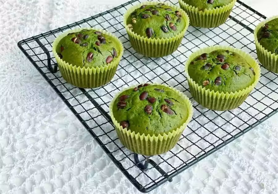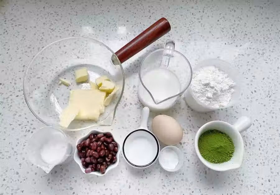 所用食材:低筋麵粉88克,抹茶粉12克,無鹽黃油50克,細砂糖55克,鹽1克,牛奶90克雞蛋1個,泡打粉4克,蜜紅豆80克