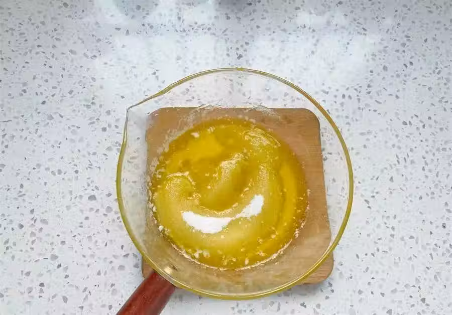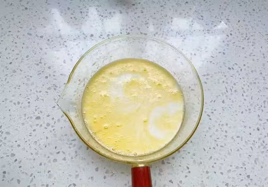 2、首先把無鹽放油隔熱水融化成液體,加入細砂糖一起,用打蛋器攪拌均勻。