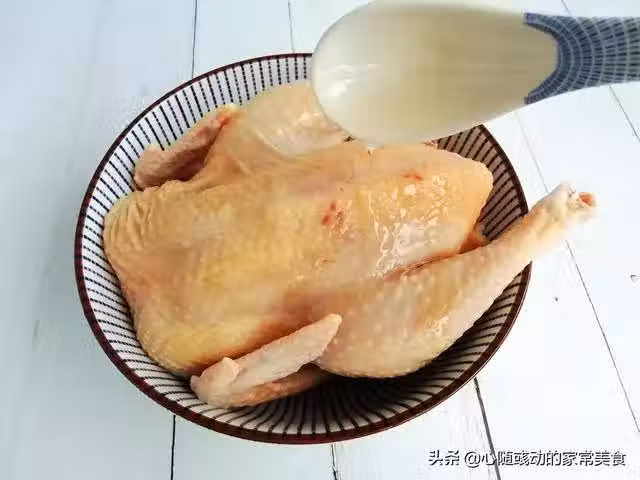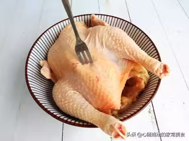第二步:把雞里里外外清洗乾淨,雞頭我懶得洗就沒要,雞脖子那一塊要翻出來把裡面的淋巴結全部剝掉,嫌麻煩的就把脖子那一段全部切掉。雞屁股喜歡吃的留著,不喜歡的切掉,雞裡面還有一些雞肺什麼的,全部要挖乾淨,因為做烤雞是不焯水的,所以我們洗的時候也要多搓幾下,清洗得乾淨一些,吃起來更放心。把雞肉上的水分甩掉,用叉子在雞肉比較厚的地方扎幾下,方便入味。