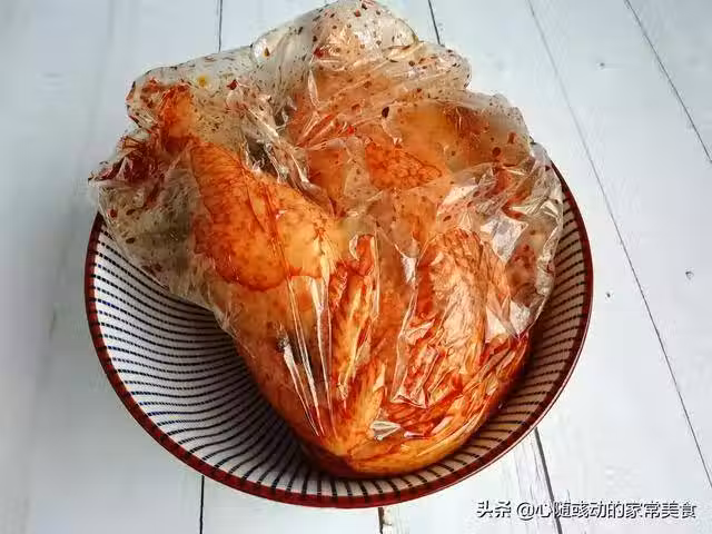 第五步:把雞肉連料汁一起倒入保鮮袋中綁緊,腌制6個小時以上,現在天氣熱,建議大家腌制的時候,放冰箱冷藏,避免雞肉變味,腌制的過程中,時不時給雞肉翻個面,再揉一揉,給雞肉做個按摩,讓雞肉更入味。