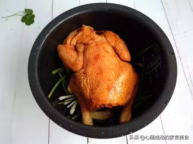 第六步:把剩下的香蔥和薑片鋪在電飯煲底部,再擺入腌制好的雞肉,淋入剩餘的料汁,蓋上鍋蓋,選擇煮飯鍵,保溫後即可出鍋享用。現在的智能電飯煲,一般有兩個煮飯鍵,一個是香彈煮40分鐘,一個是加快煮20分鐘,我選的是40分鐘那個,按一次就可以了,如果是20分鐘的就要等保溫後,拔掉電源,再按一次,煮40分鐘,口感剛好,雞肉可以直接撕著吃。