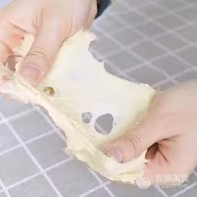 2、廚師機內加入麵粉、糖、鹽、雞蛋、冰牛奶及速溶酵母攪拌至麵糰表面光滑,可以拉出不太透光但是能均勻裂成圓洞的薄膜。