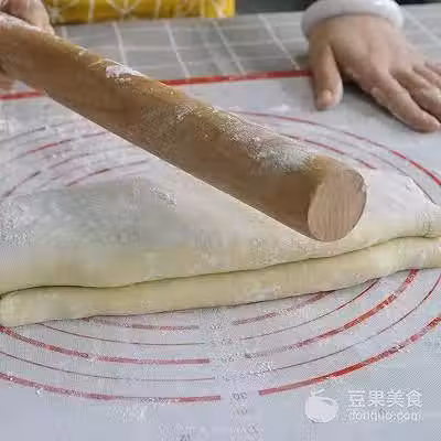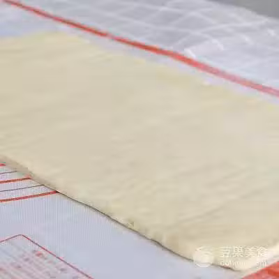 6、30分鐘後取出,擀麵棍和短邊平行,擀成原來的三倍,第二次三面二折,裹上保鮮膜,冷藏20分鐘。
