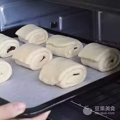 9、把蔓越莓放在一端捲起,放入烤箱,25度發酵1.5-2小時。