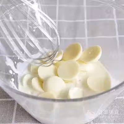 11、奶油隔水加熱到五十度,然後倒入巧克力攪拌至融化。