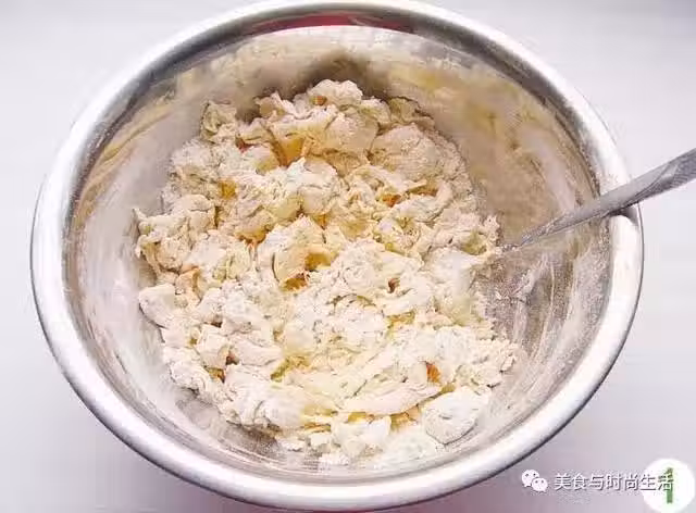 1 南瓜泥中加入酵母水拌勻,再放入麵粉,攪拌成雪花狀。
