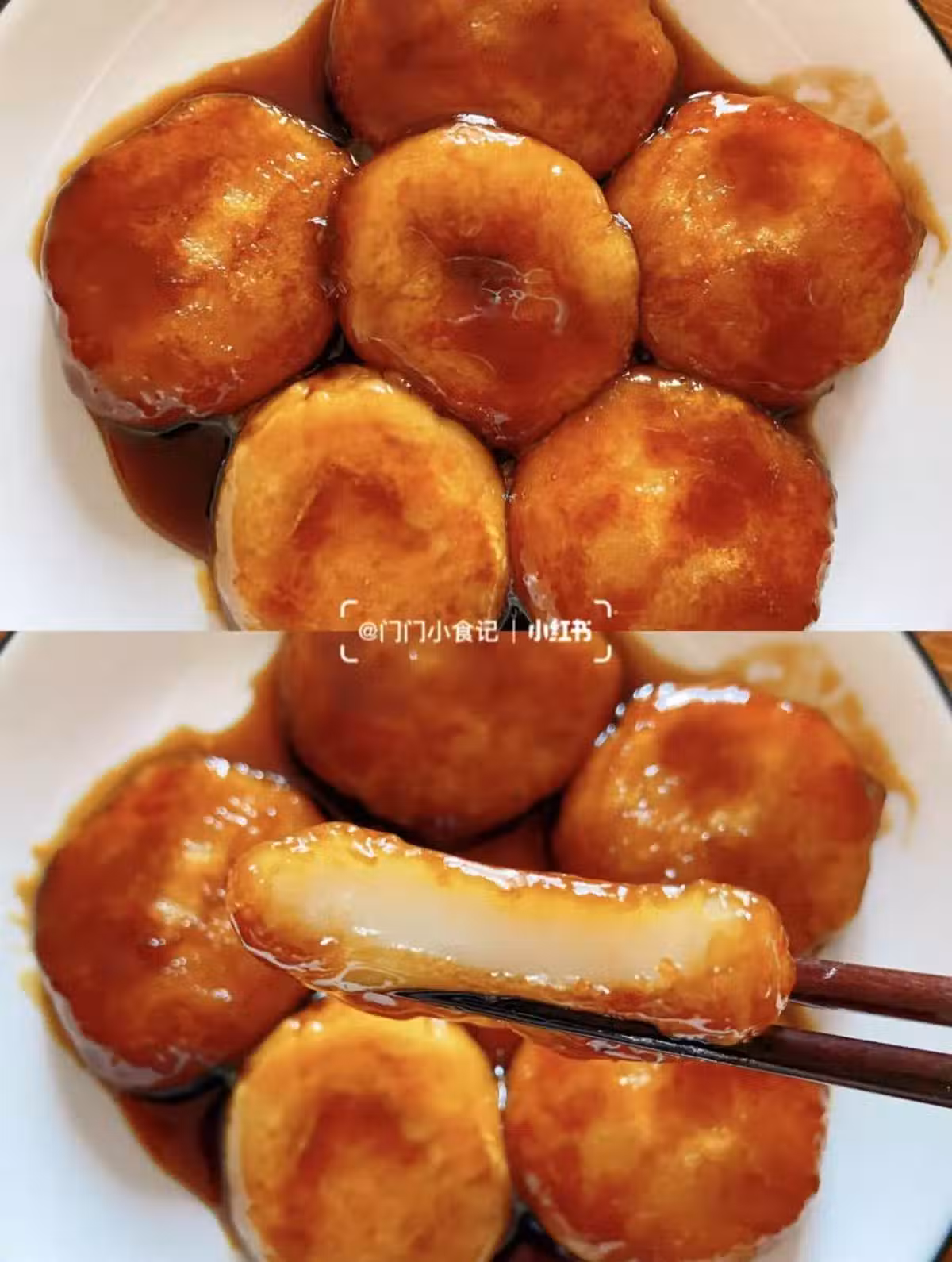 (三)鍋里放油燒熱,放入糯米餅煎至兩面金黃,倒入紅糖水煮至濃稠即可