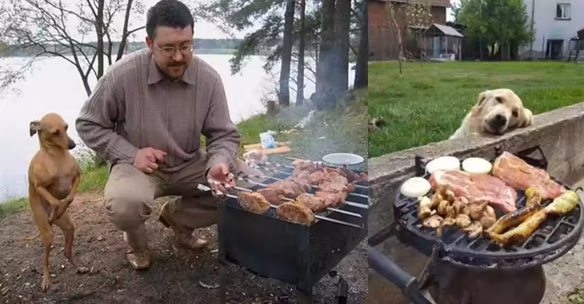 汪星人肚子「餓扁扁」 聞到肉香直流口水 踮腳趴望:把拔 好了沒? 我餓惹