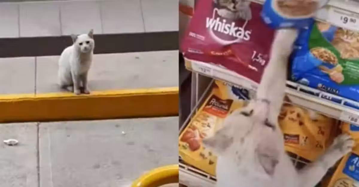 路人摸了下流浪貓,然後被貓咪帶進超市,貓咪指著貨架:想要這個,可以嗎?