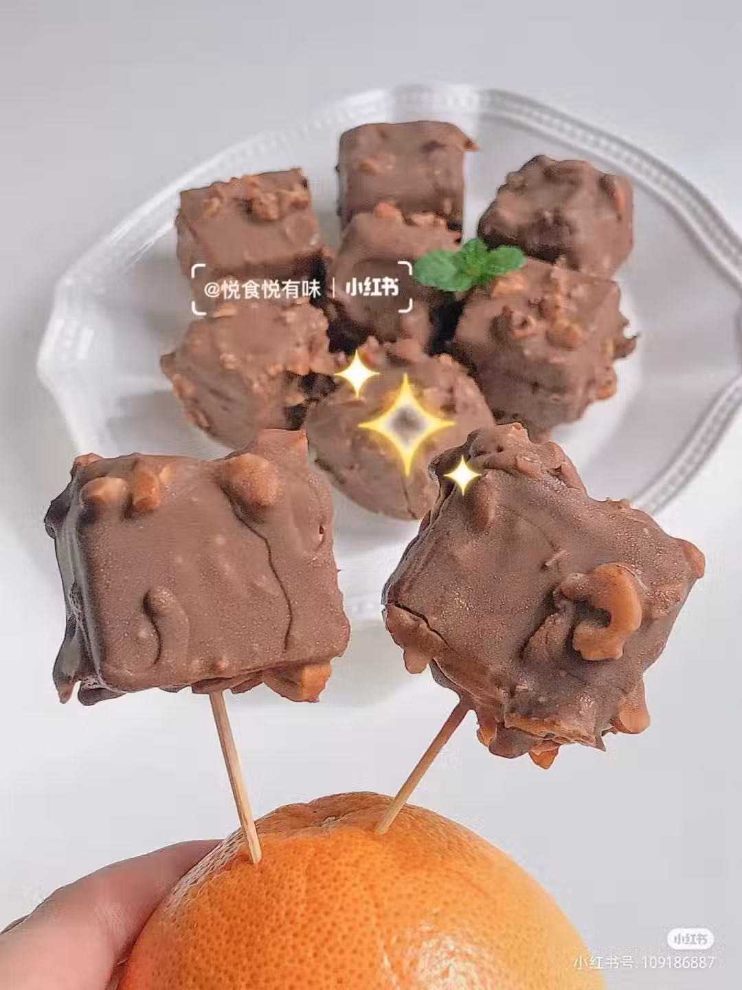 取出凍好的冰淇淋,脫模後在巧克力里蘸一圈即可形成脆皮