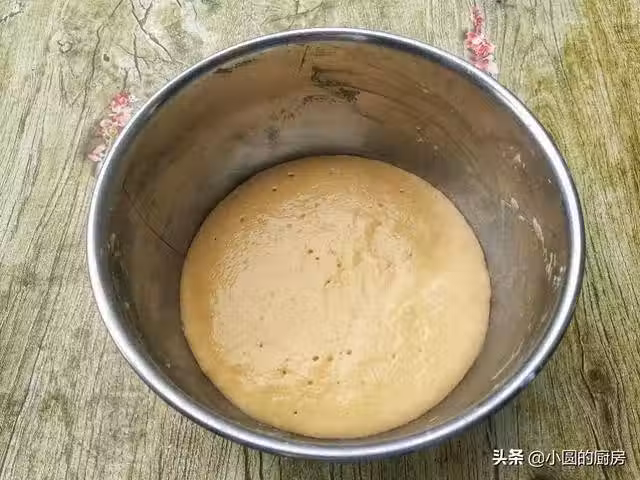 步驟三:碗上蓋一個蓋子,或者是蓋上保鮮膜,讓它發酵至兩倍大,發酵好的狀態,充滿了氣孔,體積明顯變大