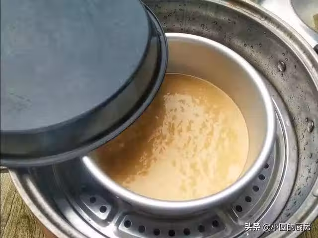 步驟五:準備好一個六寸模具,在模具中刷一層油防粘,把拌勻的液體倒進去,拿出模具輕摔一下,震出裡面的大氣泡,冷水放入蒸鍋,上面蓋上一個蓋子,防止水蒸氣滴在上邊,影響成品