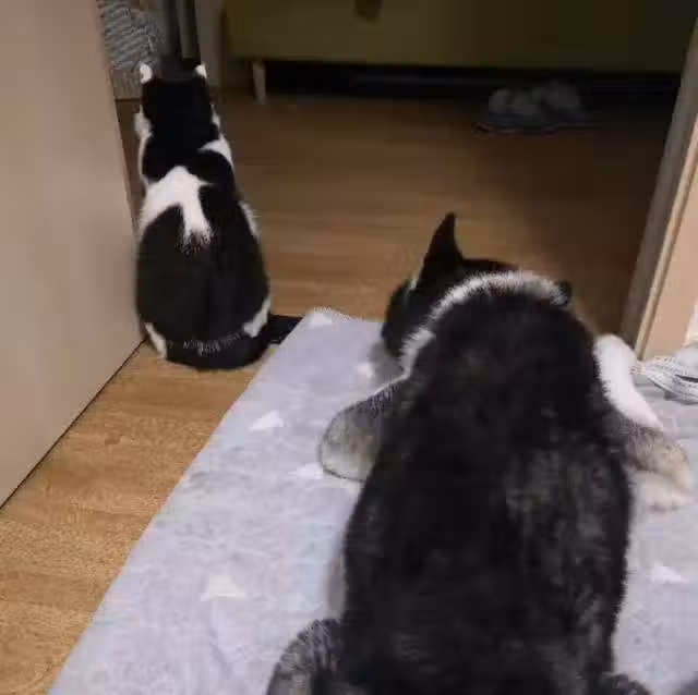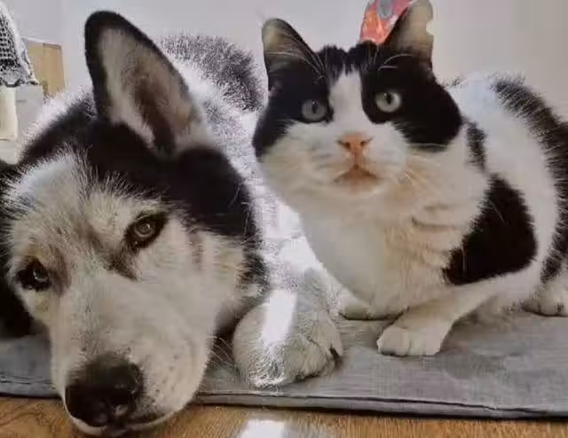 上圖中,左邊是我們今天的主人公,牠是一隻哈士奇,名字叫狗哥,右邊的奶牛田園貓,也是我們的主人公,叫貓弟。