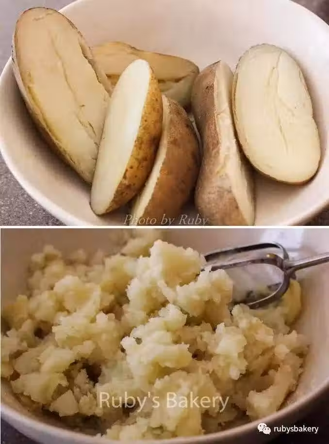 1.土豆蒸熟後去皮,壓成泥(不需要壓的很細膩。有粗顆粒的土豆塊就行)
