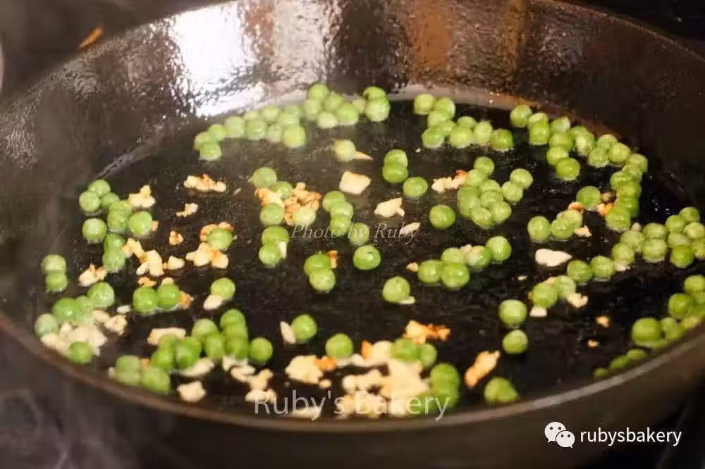 2.熱鍋放油後轉中小火,放蒜粒和青豆炒幾下。