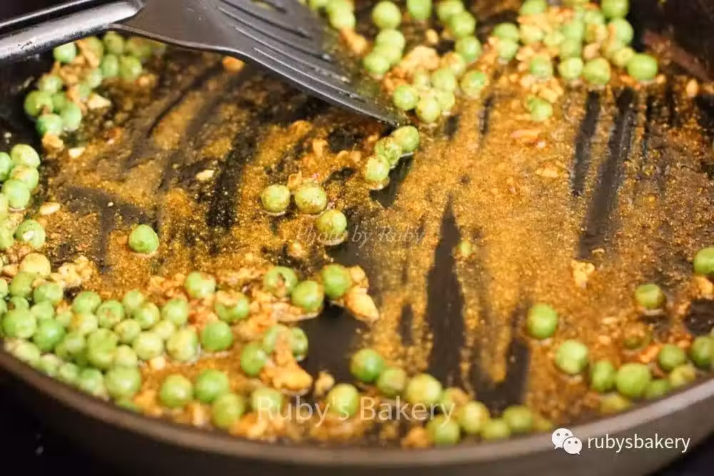 3.豌豆不需要很多,內餡土豆是主料,豌豆是點綴。內餡里也可以加一點洋蔥丁和青辣椒丁提味(和豌豆一起放鍋里炒即可)。