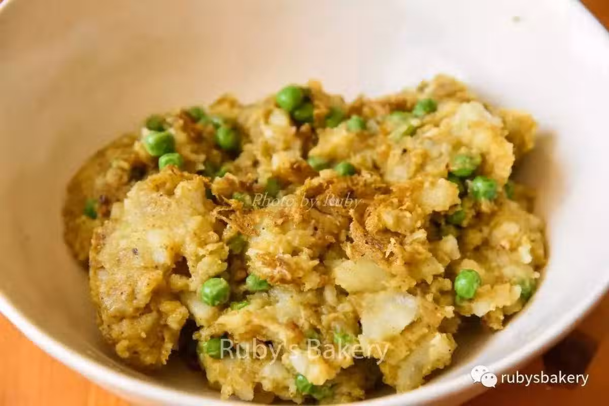 內餡:土豆約3個,豌豆約1/4cup,2-3瓣蒜,黃咖喱粉,鹽