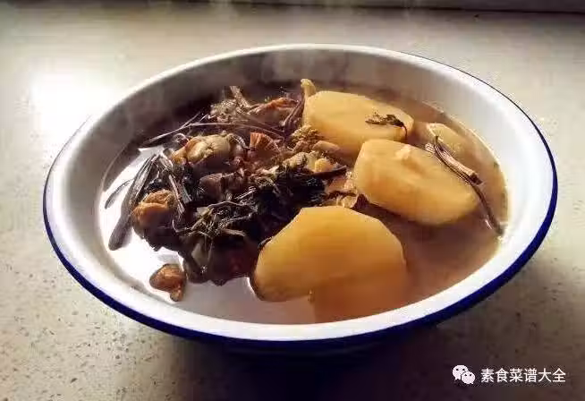 白蘿蔔1根,猴頭菇4-5顆,松蘑4-5片,干蕨菜1小把,食用油、薑片、鹽適量