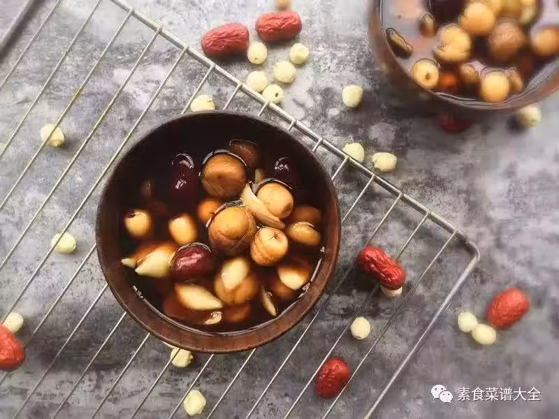 3、水開後加入紅糖,小火煮約1小時,煮到蓮子和板栗綿軟即可