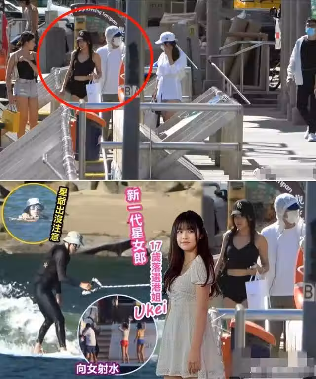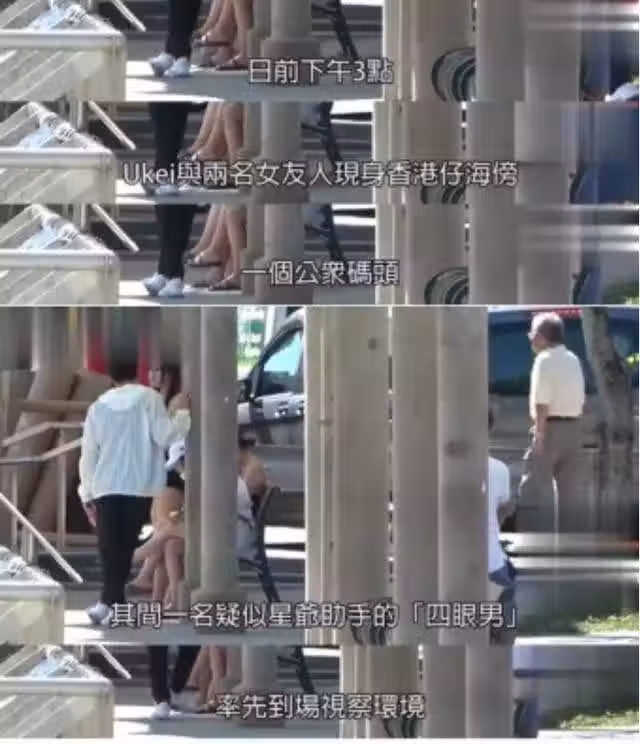 從媒體拍到的畫面中可以看出,兩人約會十分小心謹慎,先是Ukei和兩名女友人一起現身海邊的公共碼頭,隨後一名疑似星爺助手的戴眼鏡男人開始觀察周邊環境。