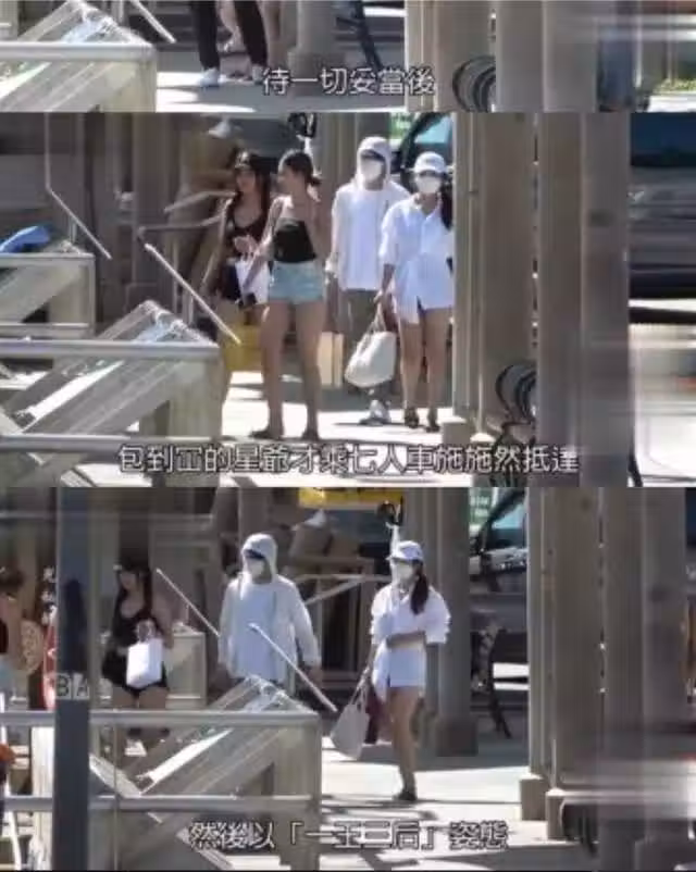 確認周圍沒有偷 拍後周星馳才姍姍來遲。只見他將自己包裹得嚴嚴實實,戴著標誌性的帽子,還以口罩蒙面,身邊跟著的三個年輕女孩,則打扮火辣,穿著熱褲與弔帶。