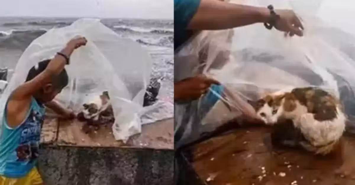 流浪貓媽媽「暴風雨中產子」,男孩不顧自己淋濕,手拉塑膠布為貓媽媽擋雨