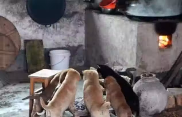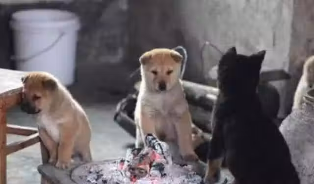 在一戶人家的火爐邊,圍著幾隻小土狗,牠們相互依偎在一起,看著好溫馨好暖心。