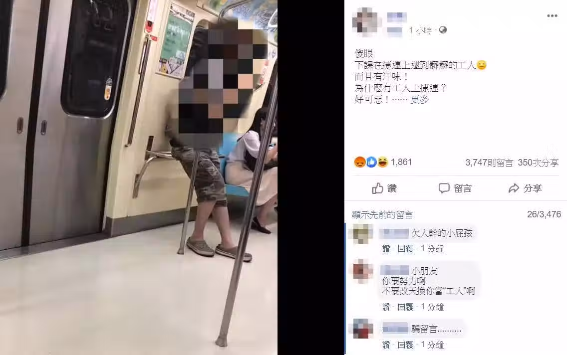 之前有一名男網友自臉書上PO出一張工人搭捷運的照片,竟酸嗆工人又臭又髒還敢搭捷運,還大言不慚的說「該不該報警請對方下車?」引起網友不爽,還搜出男網友本尊,該篇貼文在短短時間內就破6600則留言,還有700多人轉發分享。