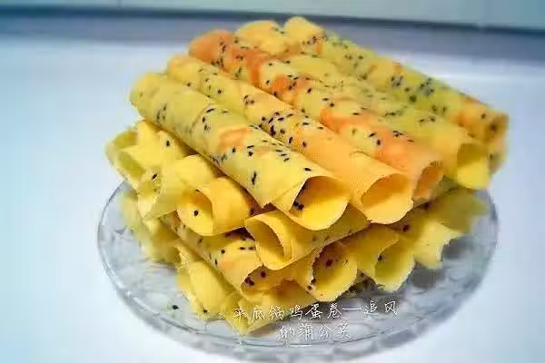4. 然後將雞蛋餅倒扣在案板上迅速用筷子捲起來,放涼定型即可(這一步一定要快,否則餅涼了就不好卷了)做完後將平底鍋用冷水沖涼擦乾做下一個直至做完。