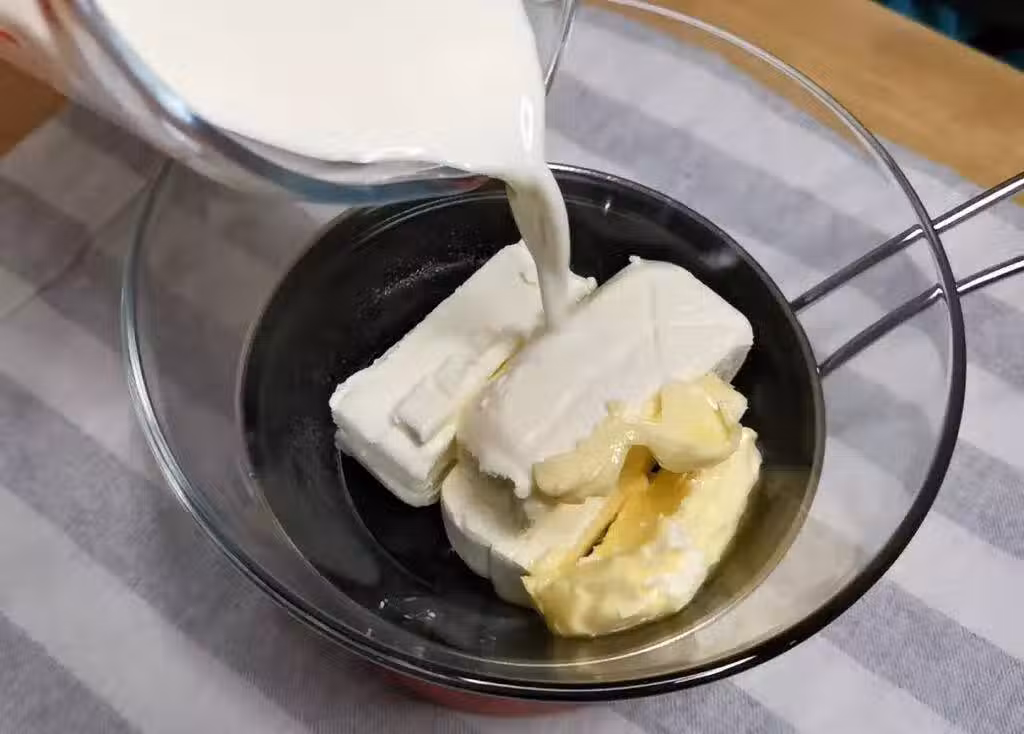 2. 將奶油奶酪、牛油和鮮奶隔熱水融化。