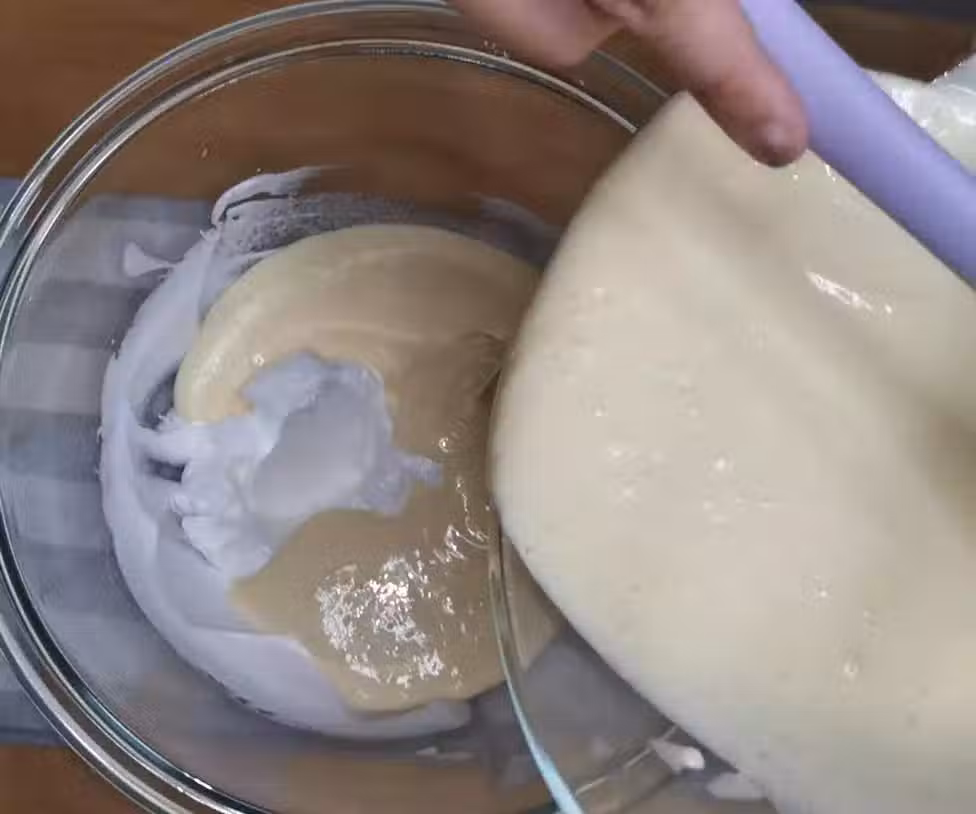 10. 最後將蛋黃糊倒入剩餘的蛋白糊里,用翻拌的方式拌勻。