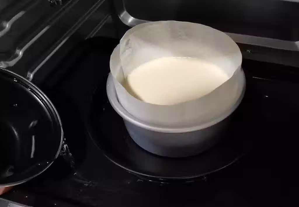 12. 將蛋糕模具放在另一個模具上以防水進入到蛋糕里(如果是用固定底模具可省略這一步驟),在烤盤裡倒入熱水。