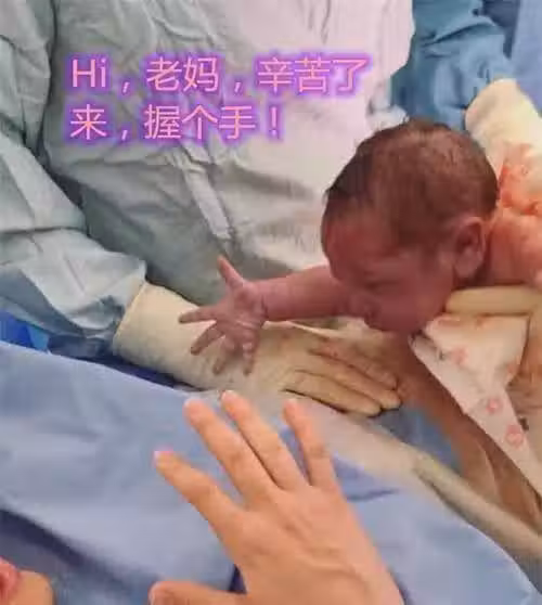 我們可以看到照片中,這個小寶寶剛生出來,身上還有著剛出生帶的胎脂呢,就向著媽媽的方向伸了一隻手,好像要和媽媽握握手,告訴媽媽,謝謝媽媽把他帶到這個世界上。