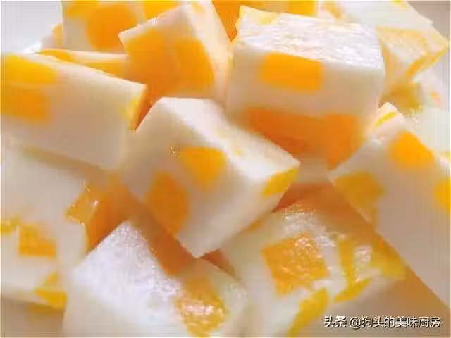 2.把純牛奶煮開,然後倒入芒果和白涼粉,迅速的攪拌均勻,等牛奶再次沸騰的時候就可以關火了,倒在盤子裡,靜放,待凝固即可。(不用放冰箱也行)