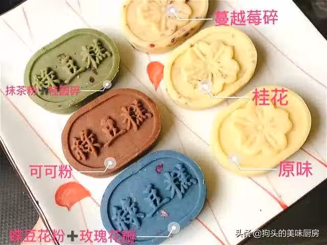 去皮綠豆250克,黃油50克,白砂糖100克,奶粉50克,可可粉適量,抹茶粉適量,蝶豆花適量,玫瑰適量,桂花適量,蔓越莓適量,桂圓肉適量。