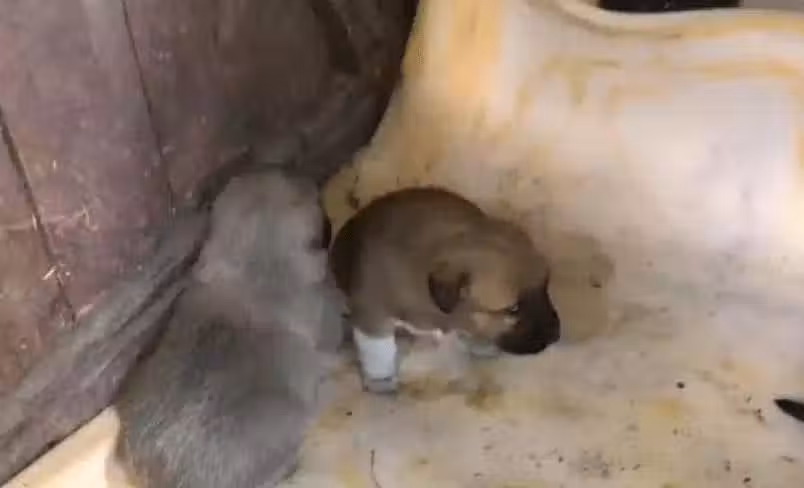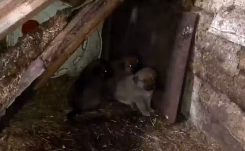門外雜草叢生,門內無比昏暗,就是這樣一個糟糕的環境裡,卻有8隻年幼小狗蜷縮在一塊兒,才剛睜眼未久。