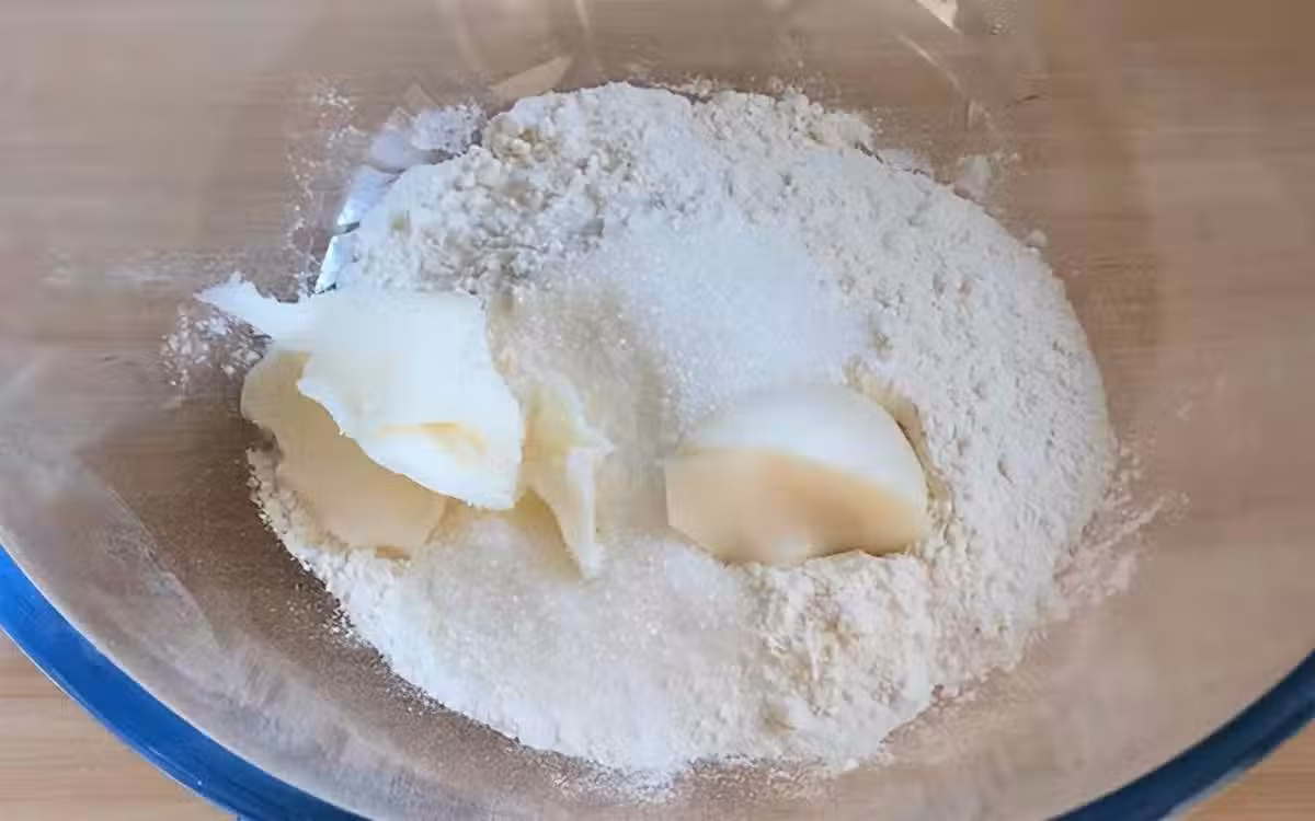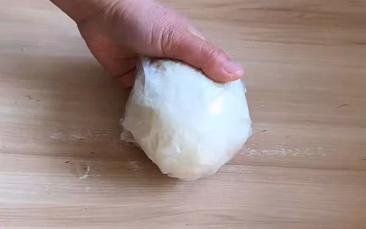 第一步:準備油皮。碗中準備150克普通麵粉,再加入30克白糖和52克豬油;接著分次加入58克清水和麵,下手抓勻後再整成團;接著把麵團移到案板上充分搓揉均勻,直到出現手套膜即可(也可以把麵團第一天和好,冷藏鬆弛),最後包上保鮮膜鬆弛15分鐘。