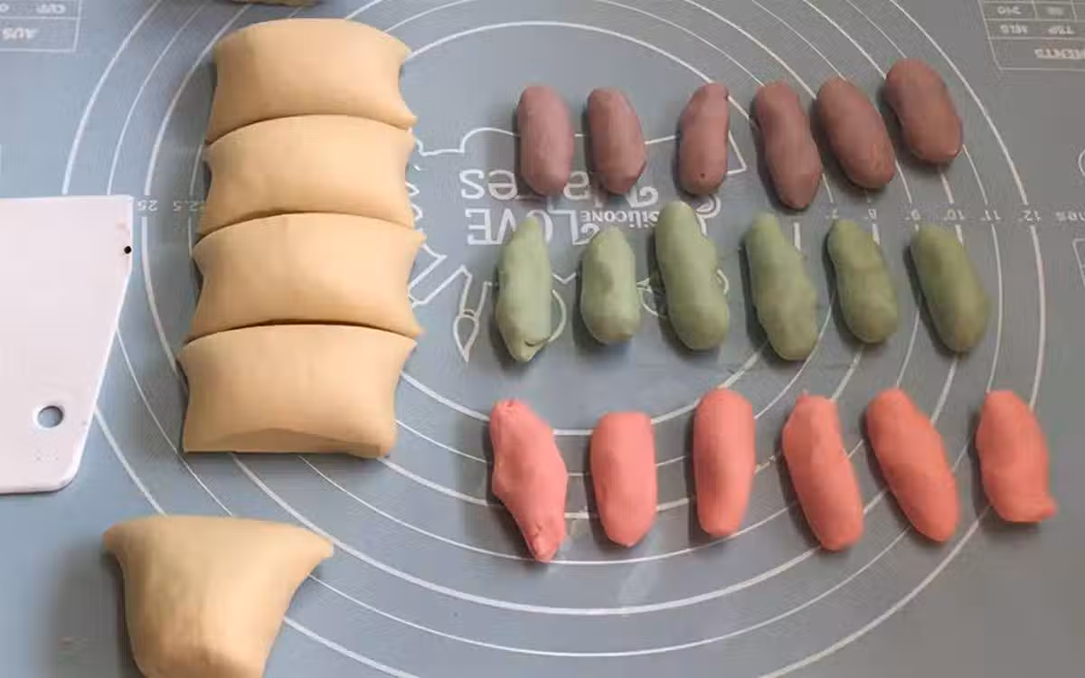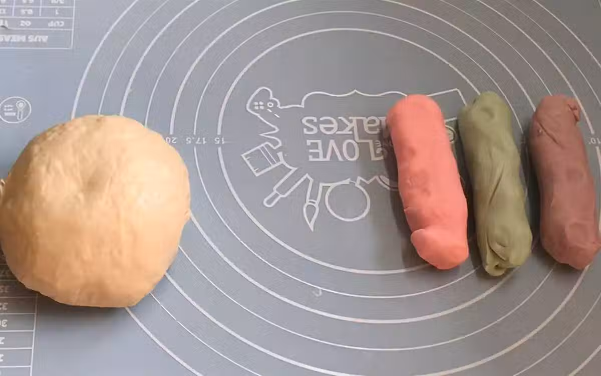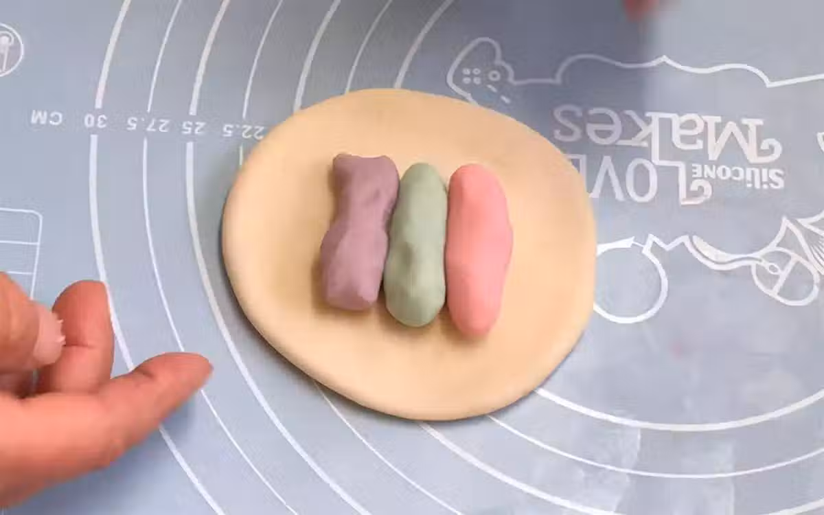 第四步:準備少許食用色素(視訊中用了三個顏色),再把油酥麵團分三份;接著在每一個麵團上都放上少許食用色素,並充分搓揉均勻備用。