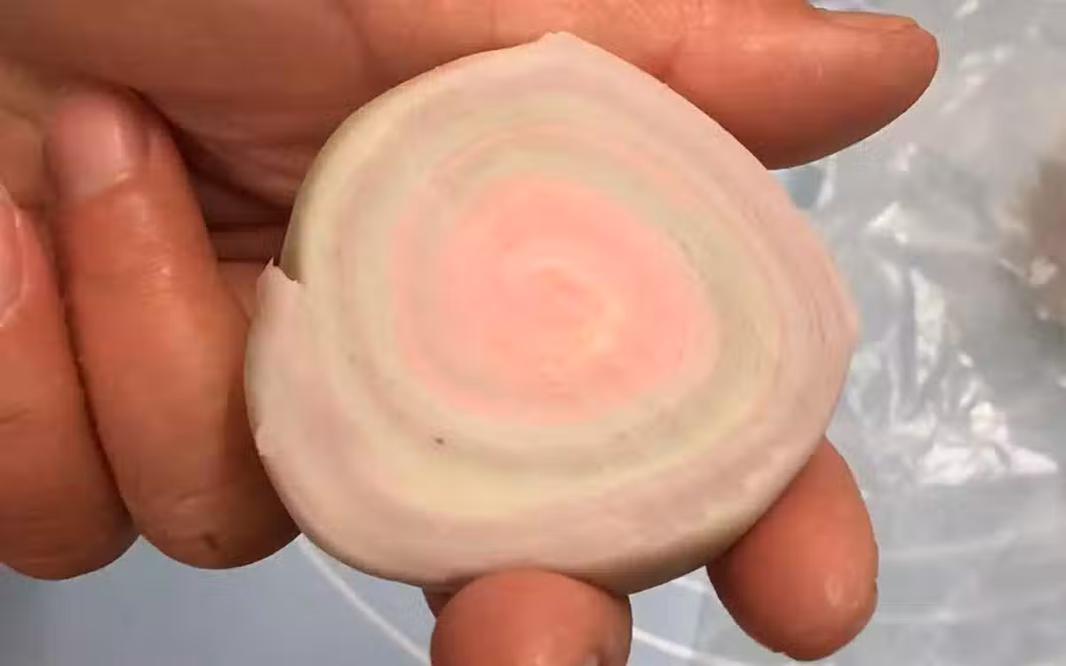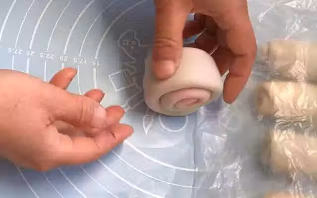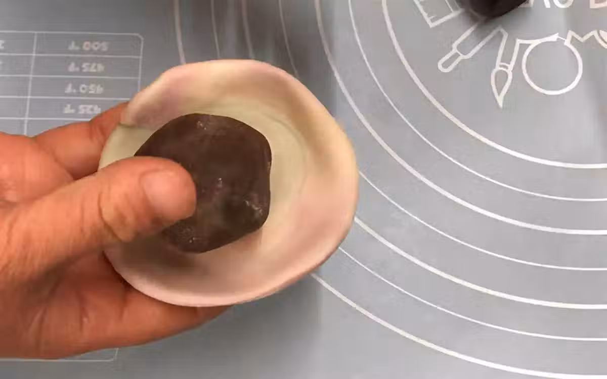 第九步:取鬆弛好的劑子,用鋒利的刀從中間切開;接著切口朝上,把劑子按扁再輕輕擀開;然後在中間放上豆沙蛋黃餡兒(儘量讓花紋的中心在頂點處),收口包好。