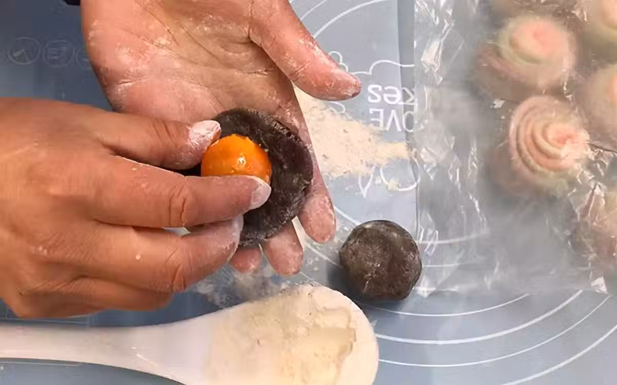 第八步:在案板上撒少許幹麵粉,然後把準備好的豆沙搓成圓,再用手按扁;接著用豆沙把烤熟的鹹蛋黃包好並搓圓備用。