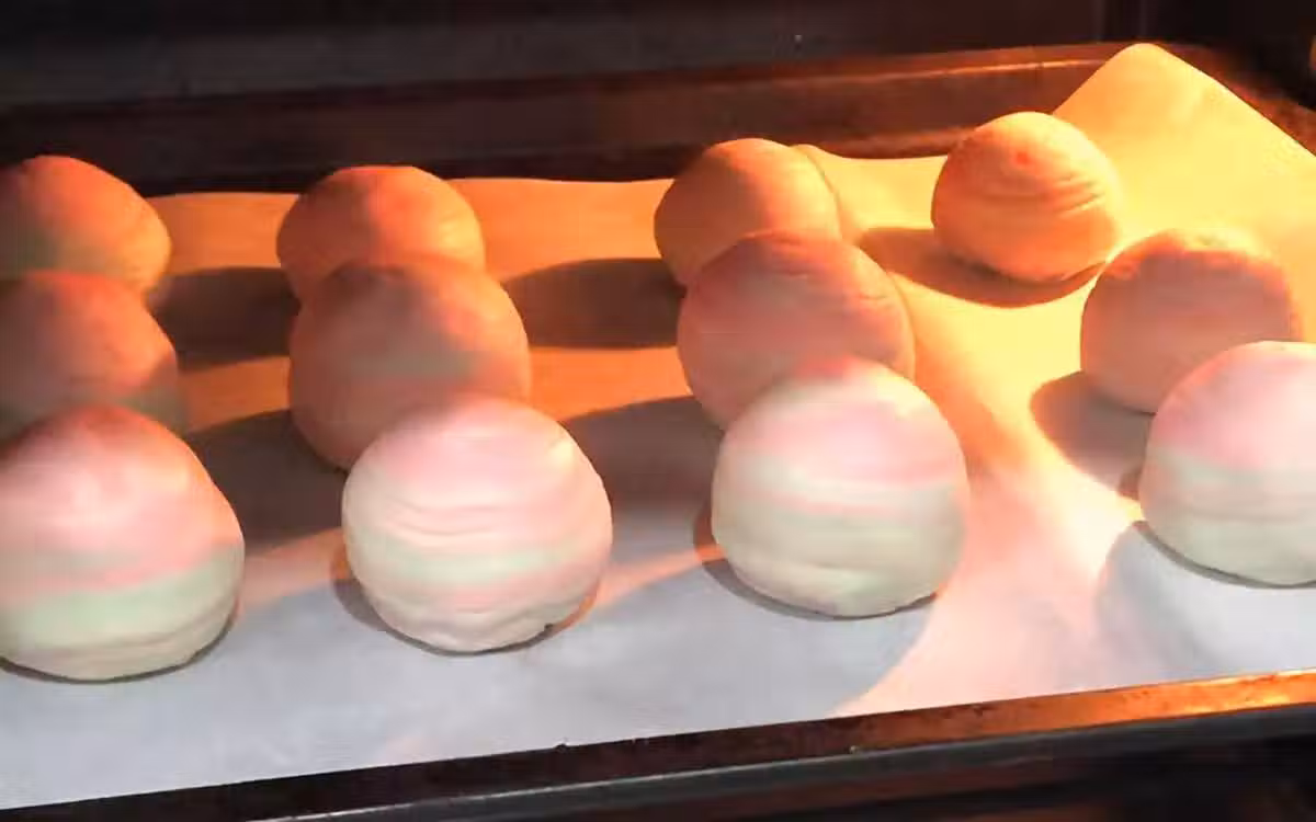 第十步:把包好的蛋黃酥生胚放入烤盤中,烤箱上下火165度預熱5分鐘;然後把烤盤放入烤箱中層,上下火165度烤25分鐘左右,上色滿意即可出爐。
